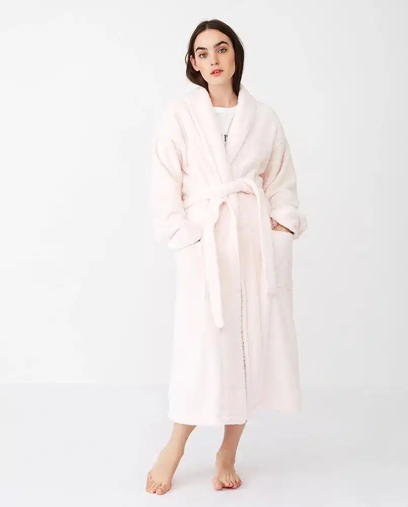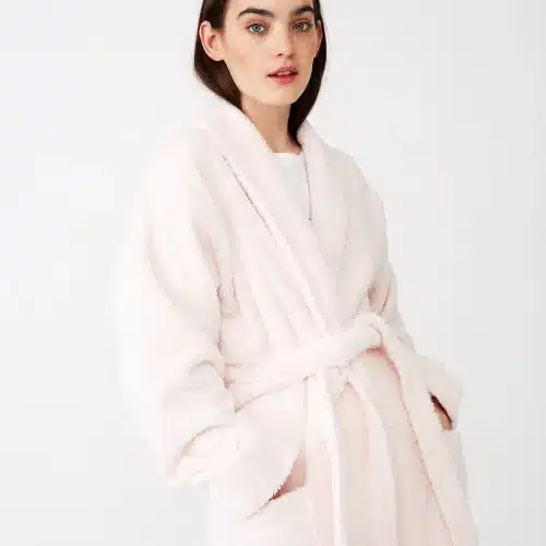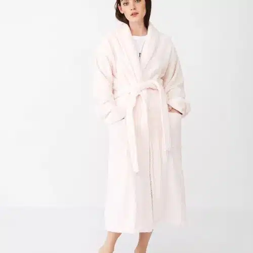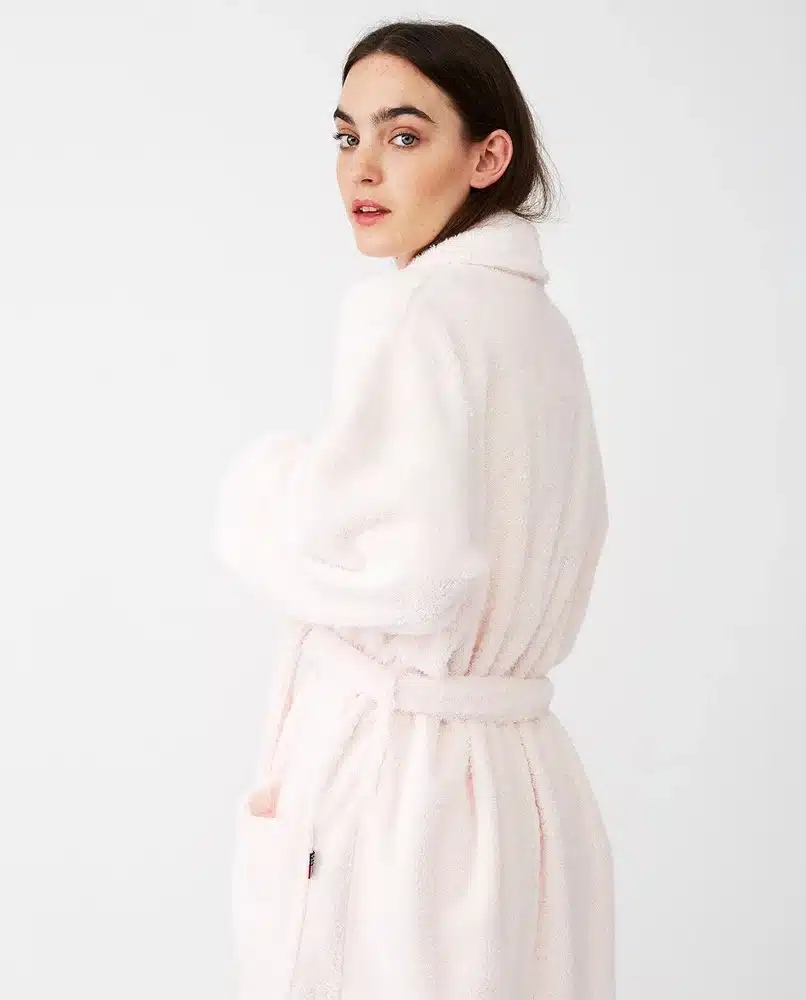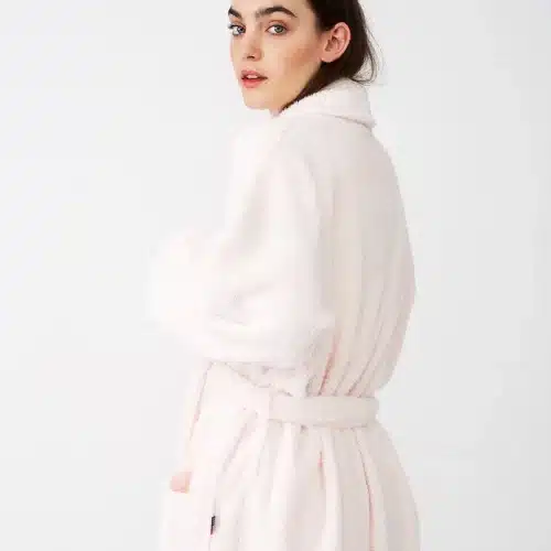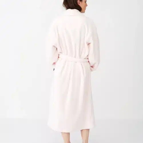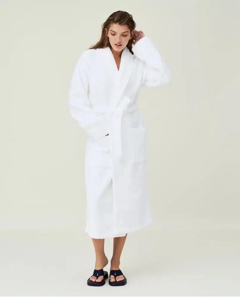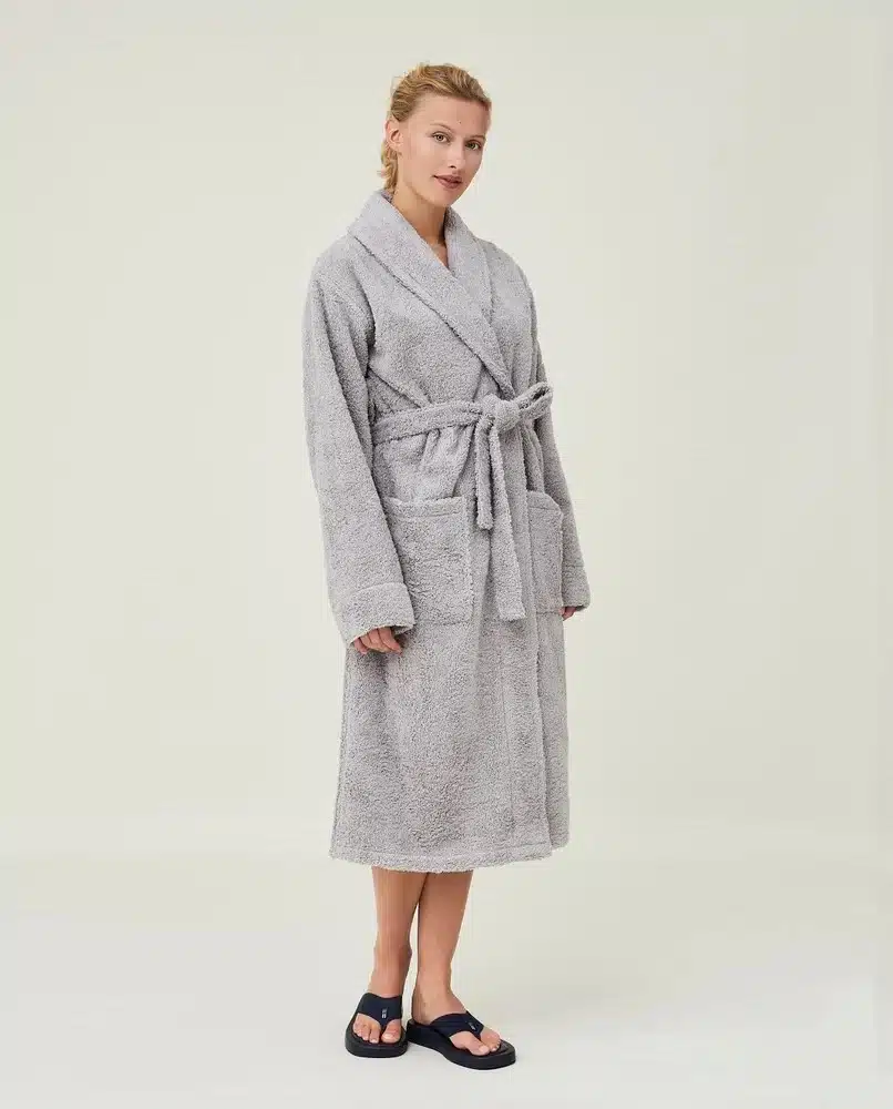 Fluffig och skön morgonrock i 90% bomull och 10% polyester med sjalkrage och fickor framtill. En riktigt skön badrock i unisex-modell; för damer rekommenderas 1-2 storlekar mindre än normalt. Längden från högsta punkten på axeln är 124 cm i storlek Medium.