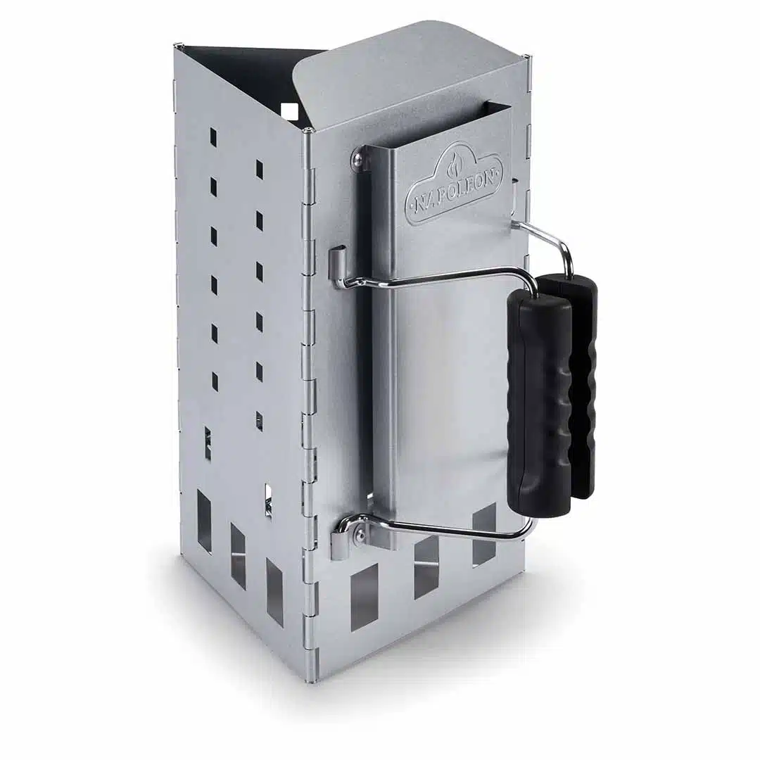 Fyll på med önskad mängd kol/briketter i och använda Napoleons tändkuber i botten av tändaren. Invänta den perfekta glöden och häll sedan över kol/briketter till din kolgrill. Tänk på att det är varmt, så använda grillhandskar.