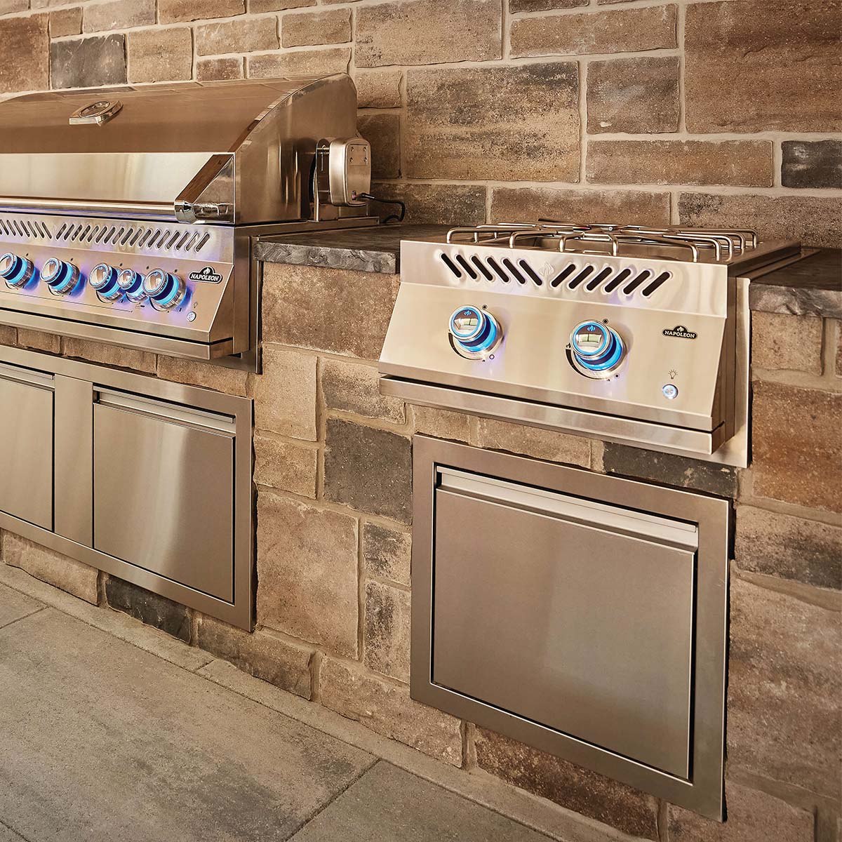 Med Napoleons inbyggnadsserie 700 skapar du ditt dröm utekök med de funktioner du önskar. Det finns en hel serie av grillar, sidobrännare, kylskåp och skåp/lådor för inbyggnad.