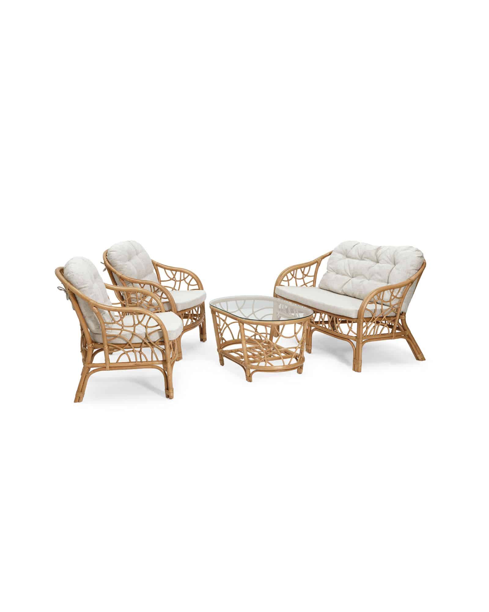 Fårö Soffgrupp kombinerar stilren design med maximal komfort. Soffan, fåtöljerna och bordet är tillverkade i naturlig rotting vilket ger varje möbel en unik karaktär. Dynorna har avtagbara, vändbara sitskuddar och fasta ryggdynor, fyllda med en mjuk polyeterkärna och fiberfill. Den här gruppen är idealisk för vardagsrum, loungemiljöer eller relaxhörnor där komfort och estetik prioriteras.