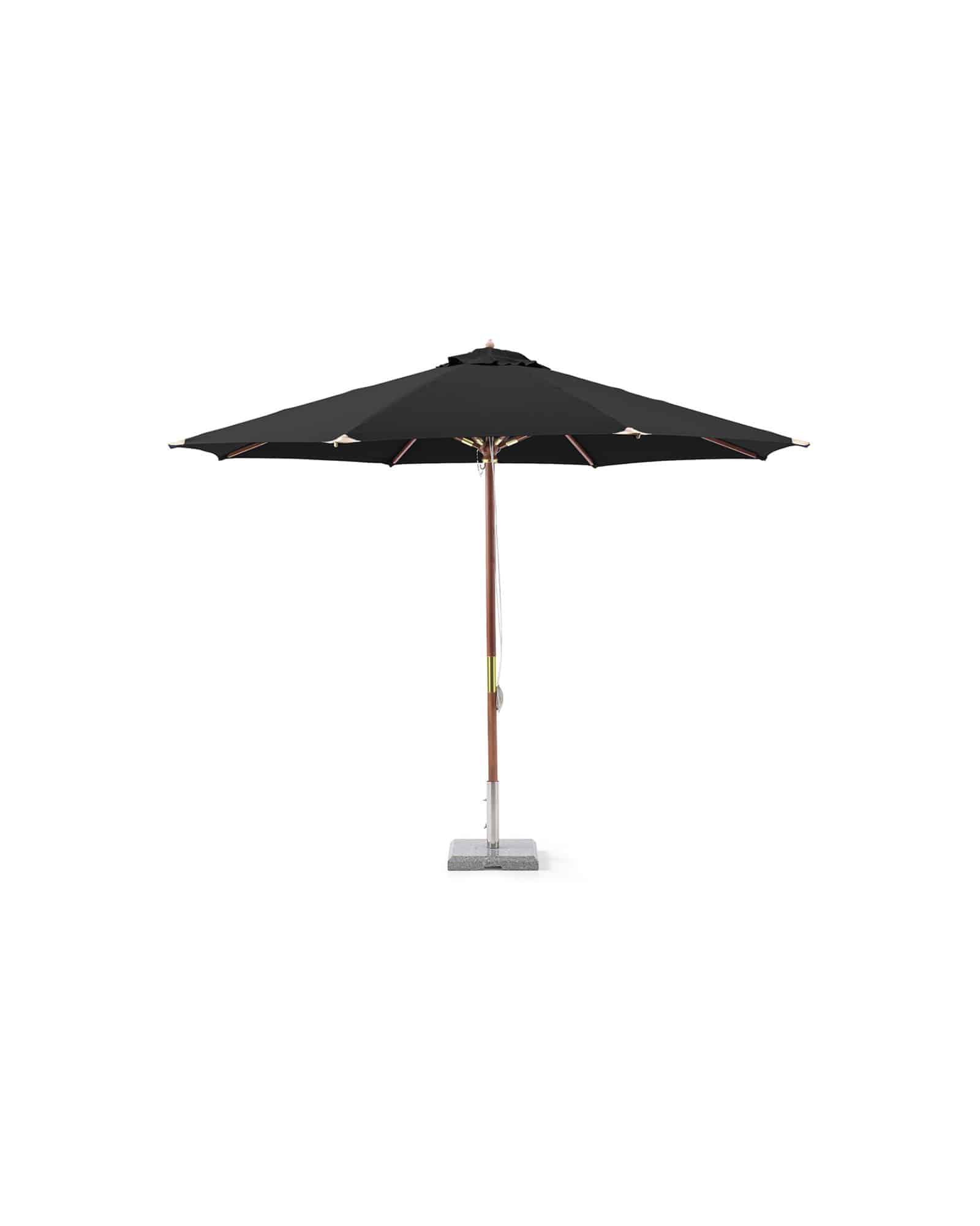 Träparasoll 335 cm svart är ett elegant och rymligt parasoll som ger generös skugga på uteplatsen, balkongen eller vid poolen. Parasollstången är tillverkad i högkvalitativt trä med 47 mm diameter och parasolltyget i slitstark svart polyester. Den smidiga fällningsmekanismen gör det enkelt att öppna och stänga parasollet. Passar perfekt för trädgårdsmöbler i lyxutförande. Parasollfot ingår ej och måste kompletteras separat.