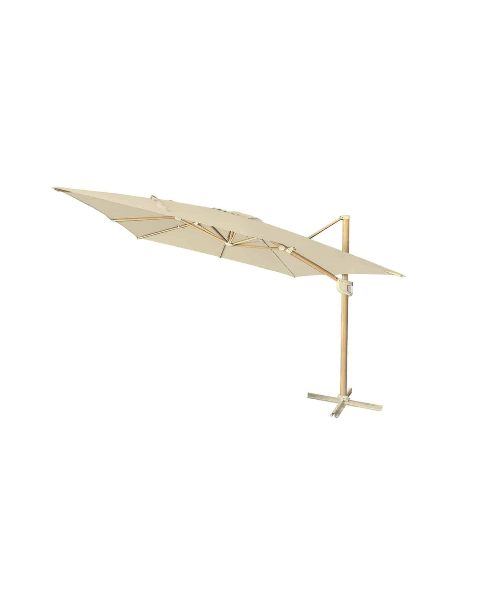 Exklusiv 3 meters fyrkantig sidewinder parasoll i gediget material som kännetecknas av hög kvalitet. Tillverkad i aluminium i trä-look utförande med tyg i olefin. Stången mäter 48 mm. Parasollet är låsbart och ställbart i olika vinklar samt roterbart runt egen axel. Del av parasollfot medföljer, komplettera med 4 st betongplatta 96425.