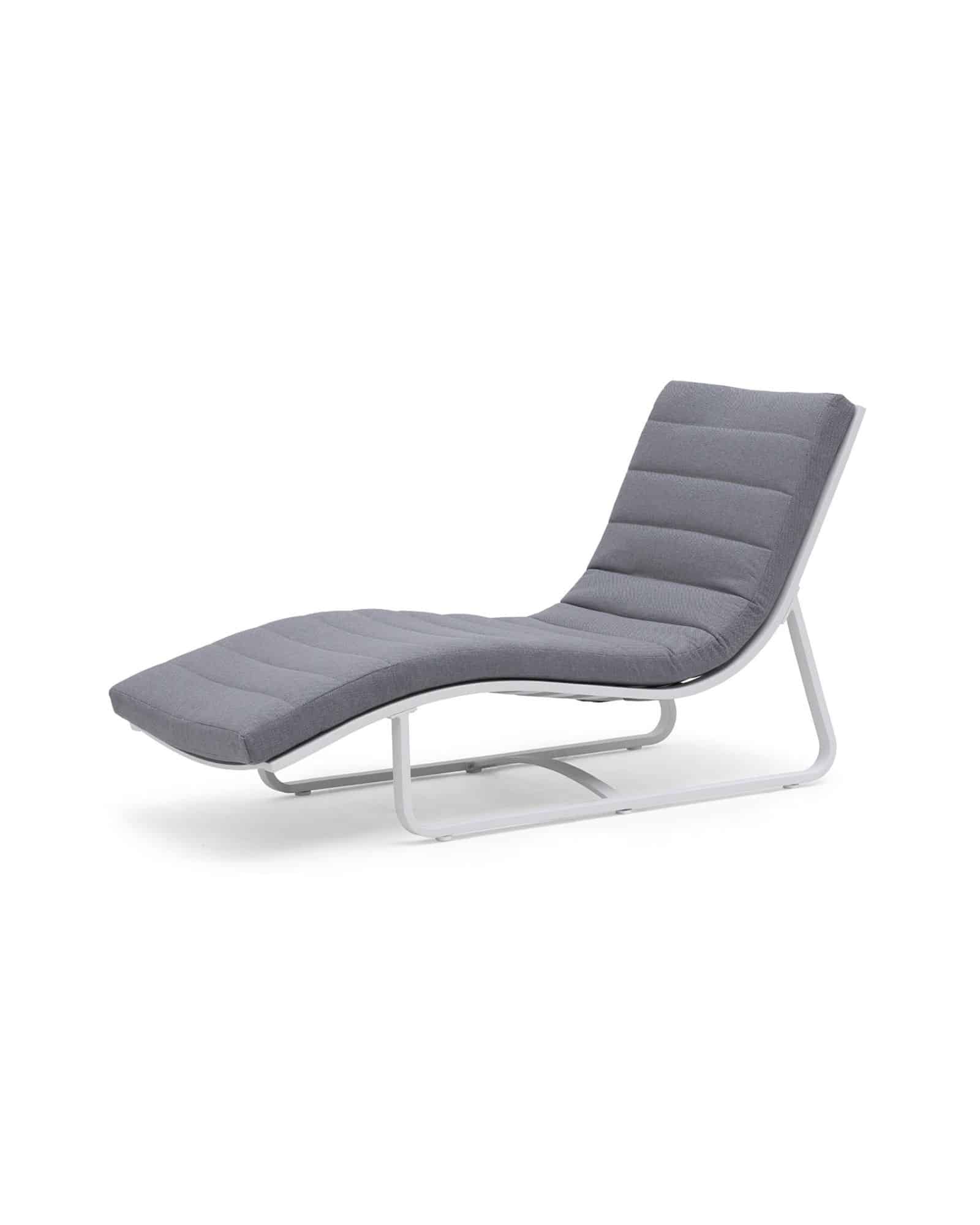 Bekväm relaxfåtölj med organisk form som andas stilrent skandinaviskt designspråk. Solsängen är underhållsfri med vattenavvisande dyna som innehåller Quickdry foam vilket gör att dynan har god upptorkningsförmåga. Tillverkad av aluminium. Ljusgrå dyna i olefin med Quick dry foam i sitsen. Quick dry är ett unikt fyllnadsmaterial med snabb upptorkningsförmåga och god sittkomfort. Det är andningsbart, har öppen cellstruktur och är väderbeständigt och fungerar därför optimalt för utomhusmöbler.