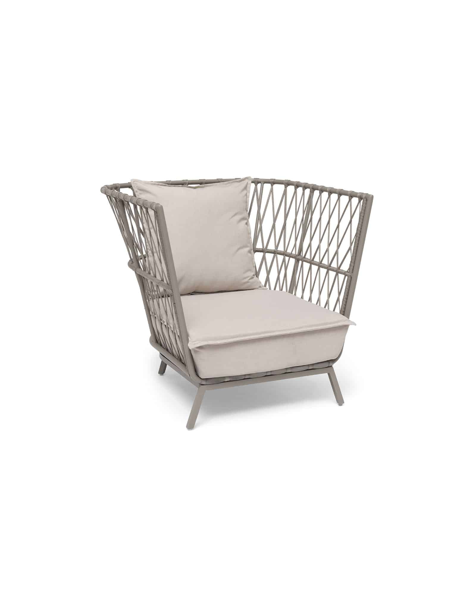 Skapa en modern och elegant miljö med Jet Set. Komplettera din loungesoffa med en fåtölj i flätade olefinband på beige aluminiumstomme. Beige dyna i polyester. Serien är designad av formgivaren Karl Malmvall.