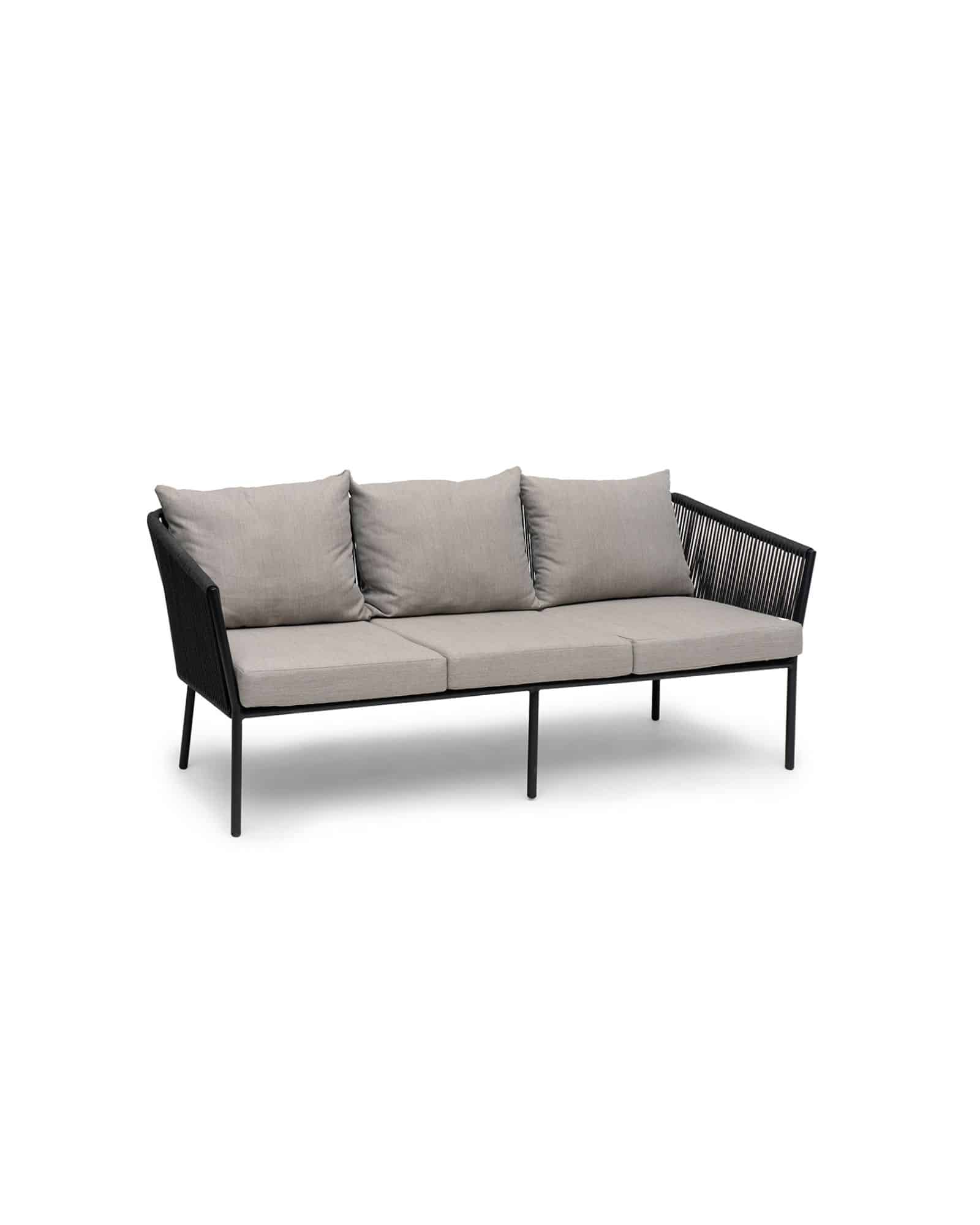 En nätt, modern och sofistikerad soffa för den lilla uteplatsen. Tillverkad i svart aluminium med flätade grå rep i olefin. Gråbeigea dynor med tyg i olefin.