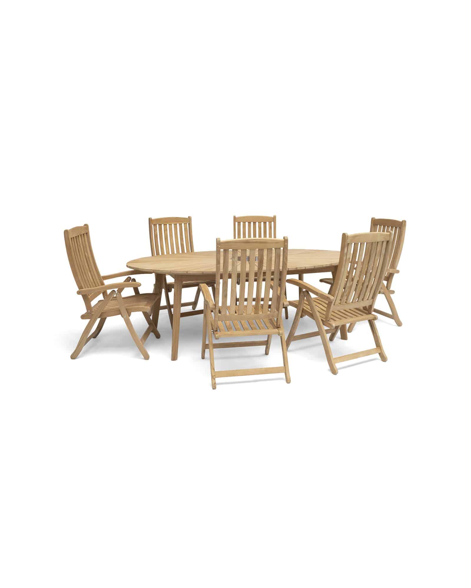 Teaken är ett hållbart material som åldras vackert över tid, vilket ger bordet en naturlig silvergrå patina som förhöjer dess karaktär. Den solfjäderformade bordsskivan skapar en unik visuell effekt och passar perfekt ihop med Hillerstorps övriga serier som Himmelsnäs, Ringsjö, Dallas och Nova.