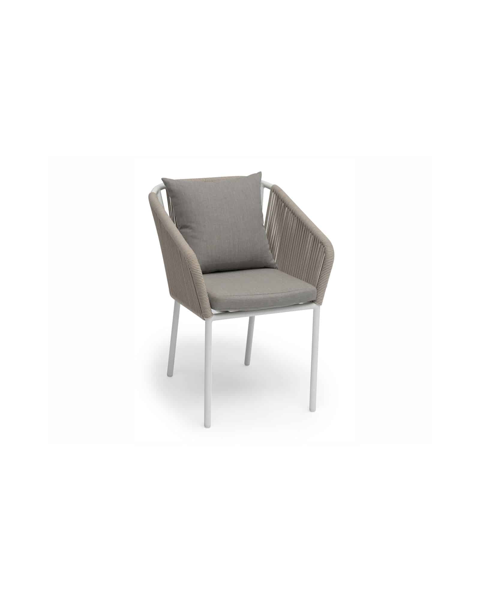 Lersund Matstol kombinerar elegans och funktion i en stilren design. Stolen är tillverkad i vit pulverlackerad aluminium med flätade rep i beige olefin som ger ett sofistikerat uttryck. Den medföljande gråbeige dynan i olefin ger hög komfort och tål dagligt bruk. Den lätta konstruktionen gör stolen enkel att flytta, och den kräver ingen montering – redo att använda direkt.