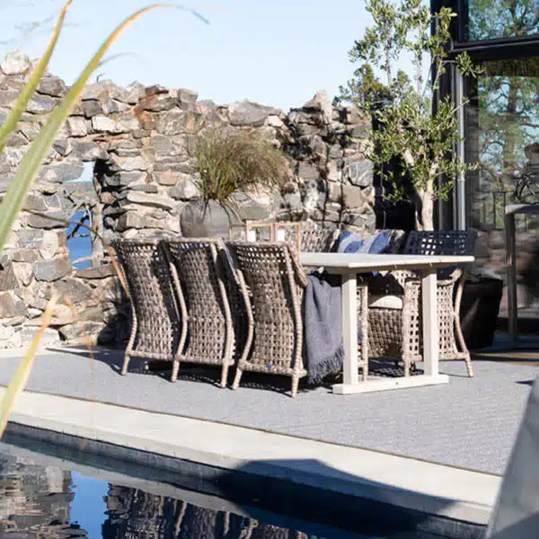 Malaga är en handflätad matstol i genomfärgad konstrotting av polyeten där den kraftiga stommen består av aluminium.