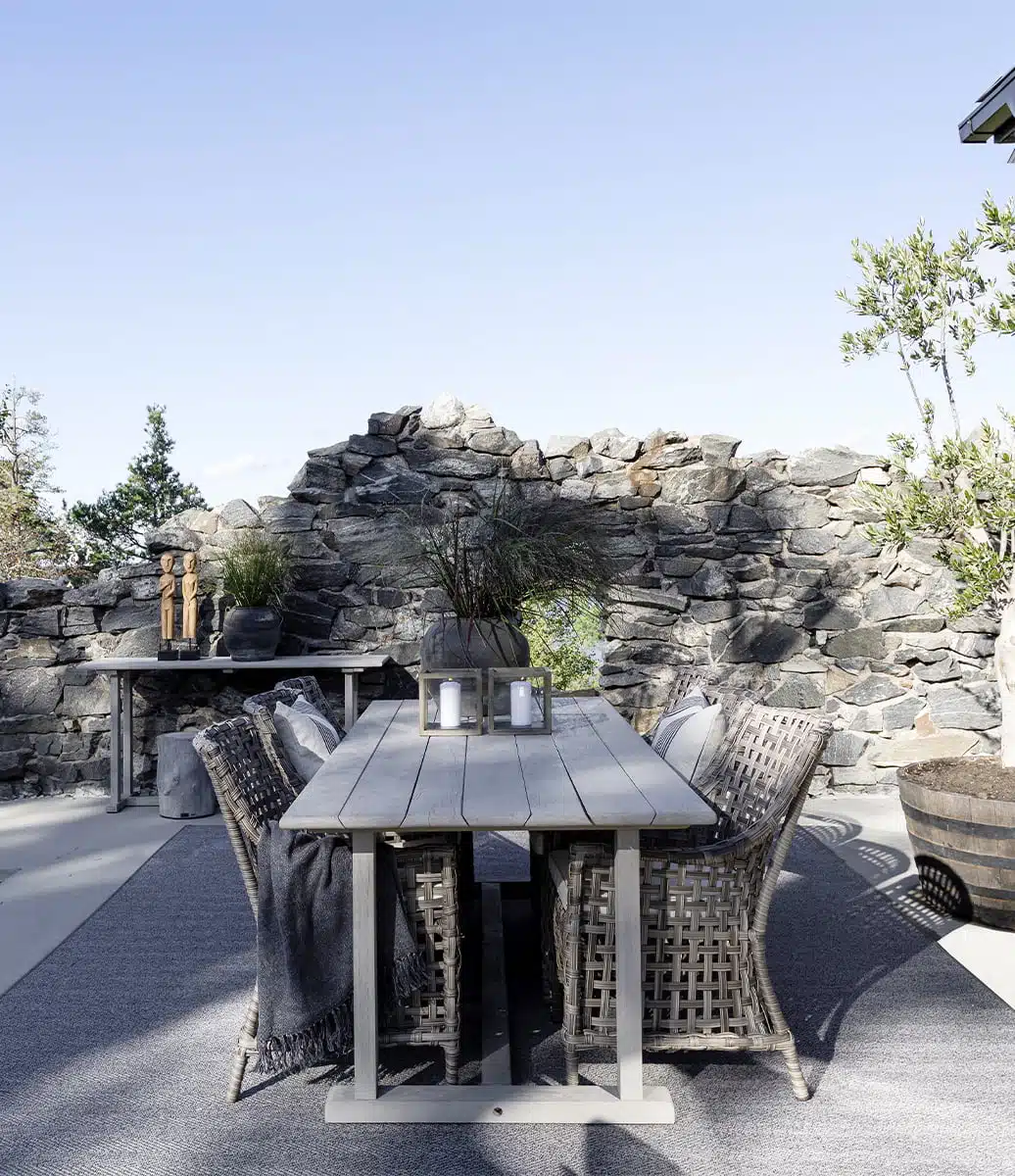 Möblerna ska behandlas ett par gånger per år med ”Teak Shield” för att behålla sitt skydd mot fläckar och vatten.