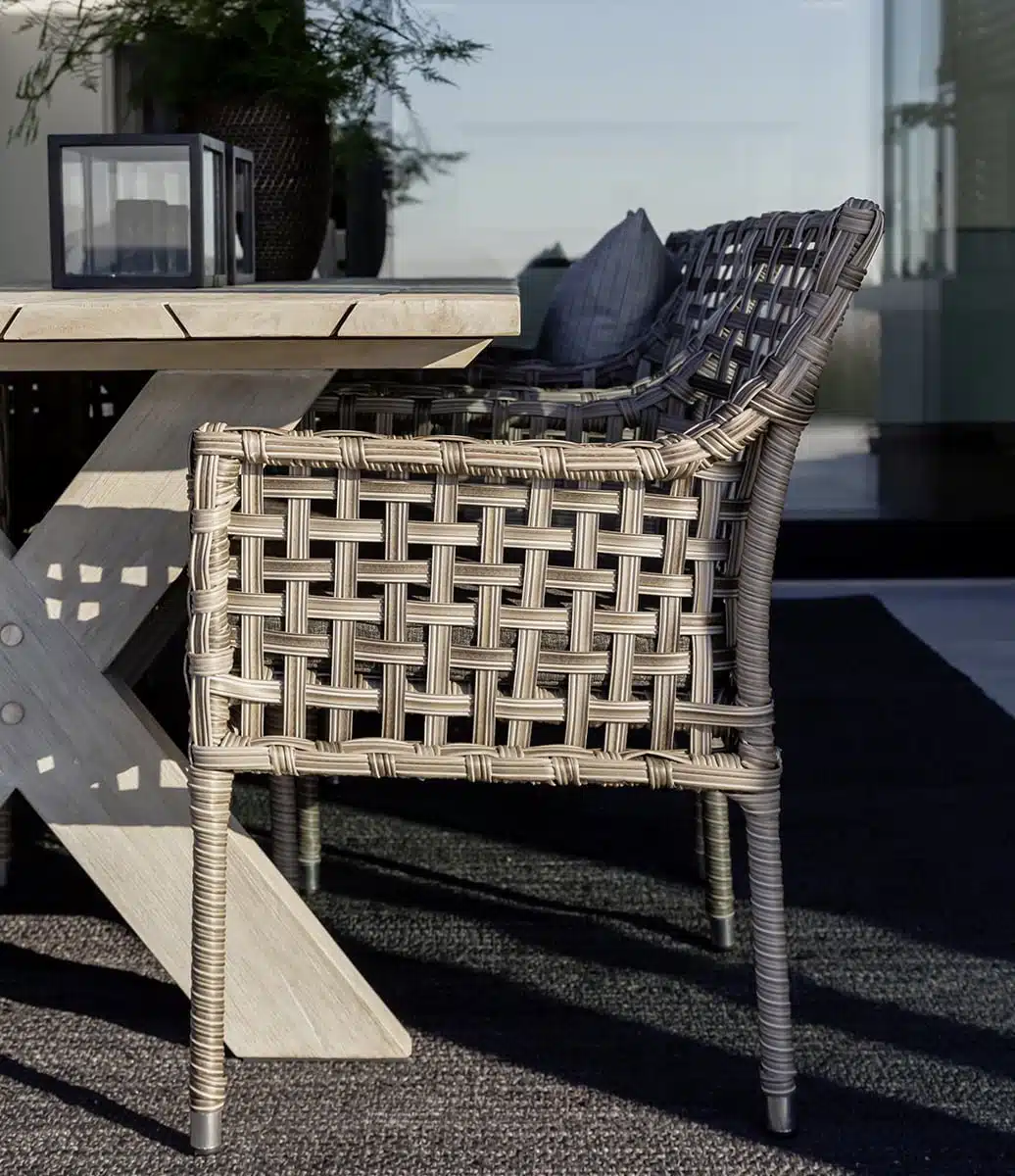 Santa Monica är en handflätad matstol i genomfärgad konstrotting av polyeten där den kraftiga stommen består av aluminium.