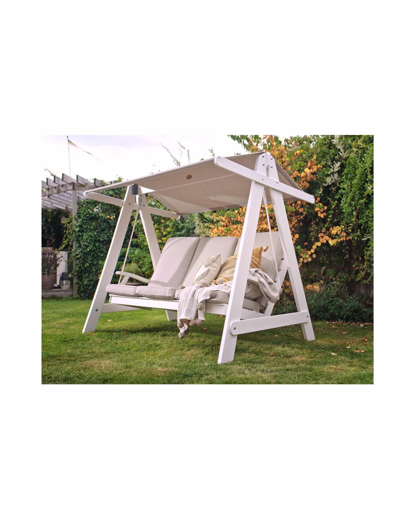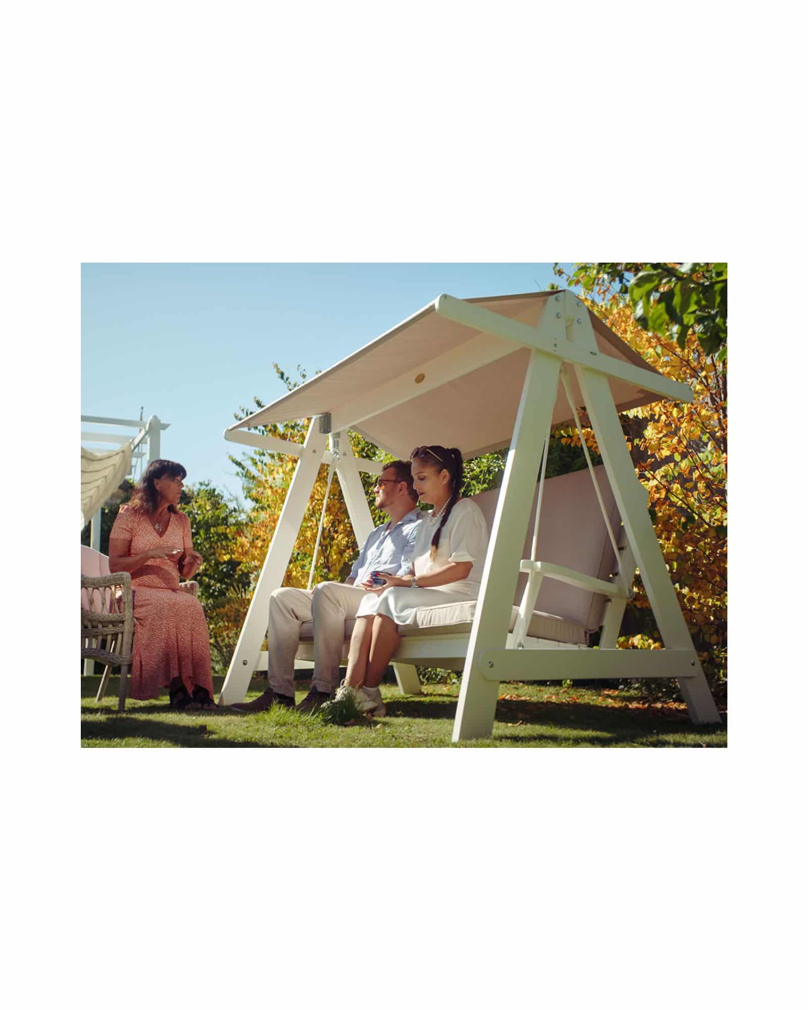 En modern hammock som med sin stilrena design och goda komfort är en av sommarens favoriter. Tillverkad av FSC®-märkt kärnfuru. Vitt rep av slitstark polyester. Tak och dynor i svart panama, en polyestermix som är 100% återvunnen. Ett slitstarkt tyg med hög vattenavvisande yta. Panama är även antibakteriell och har hög tålighet mot klorerat vatten, vilket passar utmärkt i närheten av pooler och spabad. UV-beständighet 7-8/8. Taket kan tvättas i maskin 60 grader.