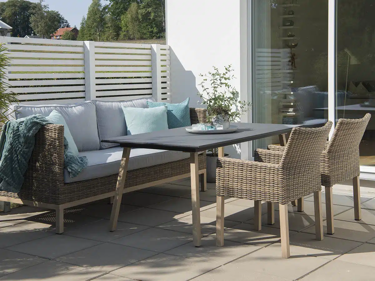 Fåtölj i naturfärgad konstrotting med aluminiumstomme. Ljusbeige dyna ingår. Kombinera med Fyrsnäs soffa och matbord och du har en både skön och snygg plats att sitta i.