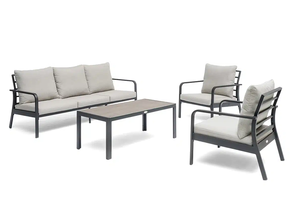 Generös soffa som med sin lätthet i designen ger ett stilrent och modernt uttryck. Tillverkad i aluminium med dynor i gråbeige olefin. Dynorna är måttanpassade för respektive komponent. Avtagbar klädsel, handtvätt 30 grader. Bordsskiva i keramisk glas. Levereras komplett innehållande två fåtöljer, soffa, bord och dynor.
