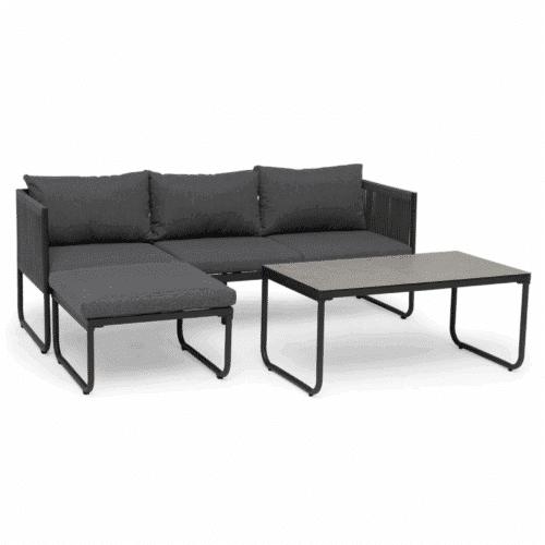 Enkel nätt loungegrupp för den mindre uteplatsen. En loungegrupp med något högre höjd på bordet än vanligt vilket gör den både praktisk och funktionell. Komplett set innehållande 3-sits soffa, divan, bord och dynor. Tillverkad i aluminium och rep i olefin. Bordsskiva i keramiskt glas. Dynor i polyester.