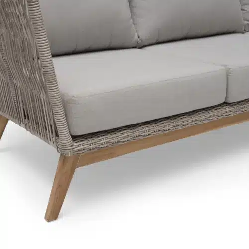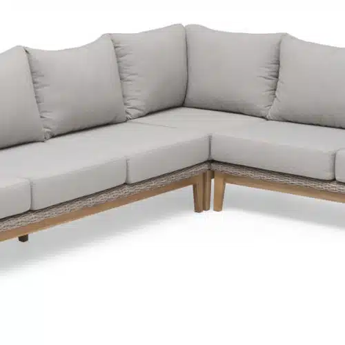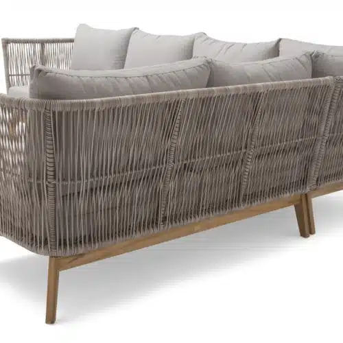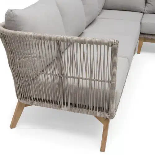 En stilfull och modern loungesoffa i beige konstrottingband. Banden är på en stomme av aluminium och stolens trädetaljer är i teak. Beige sunproof dyna tillverkad av 100% olefin ingår. Sunproof är ett väderbeständigt och UV-resistent premiumtyg. Soffan består av en 3-sitsmodul, en 2-sitsmodul och en hörndel.