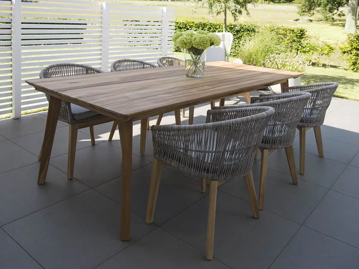 En stilfull och modern matstol i beige konstrottingband. Banden är på en stomme av aluminium och stolens trädetaljer är i teak. Beige sunproof dyna tillverkad av 100% olefin ingår. Sunproof är ett väderbeständigt och UV-resistent premiumtyg. För extra komfort kan du köpa till Himmelsnäs ryggdyna.