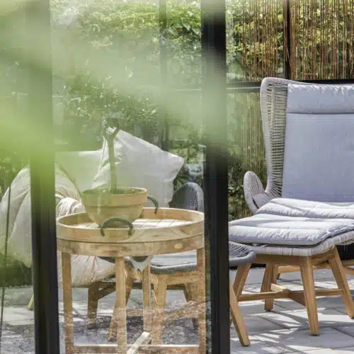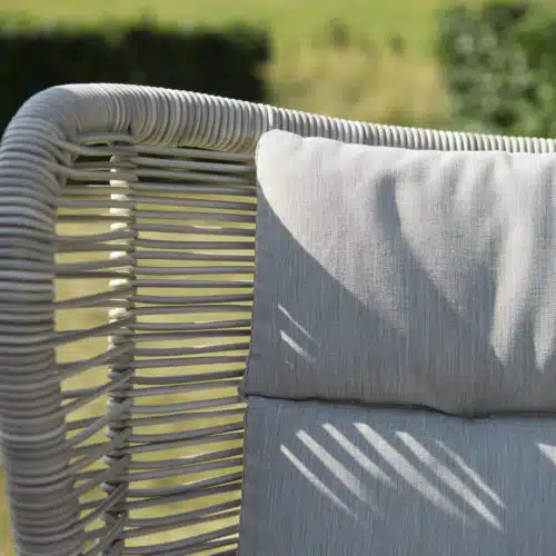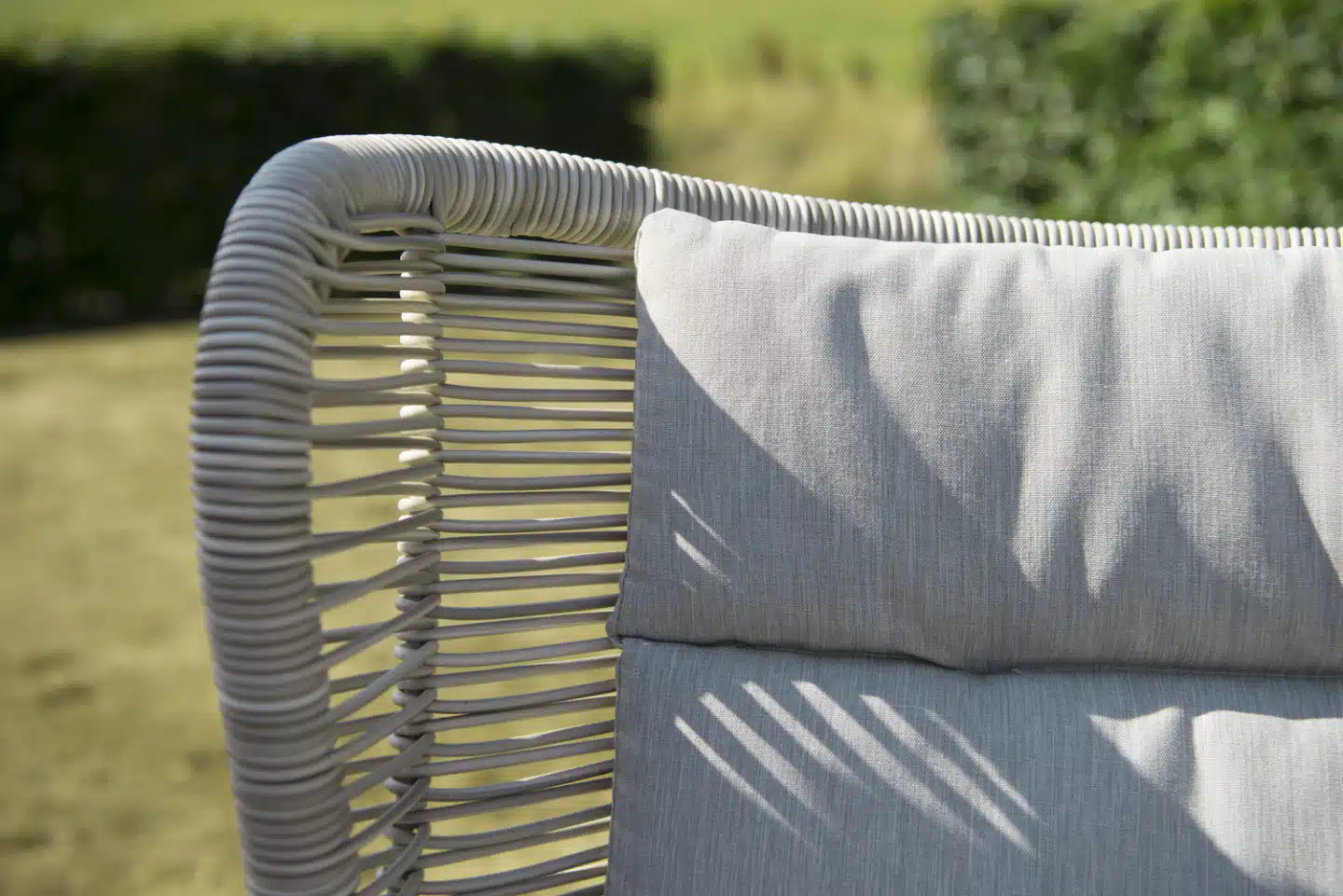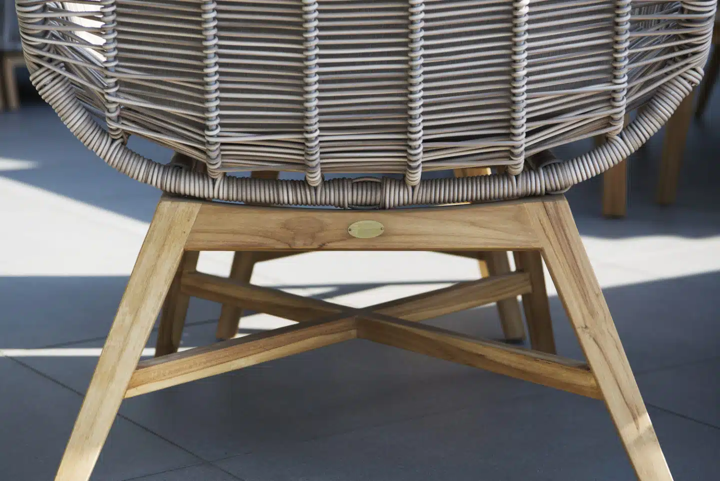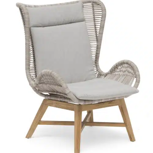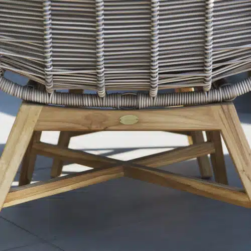 En stilfull och modern vilstol i beige konstrottingband. Banden är på en stomme av aluminium och vilstolens trädetaljer är i teak. Beige dyna i olefin.