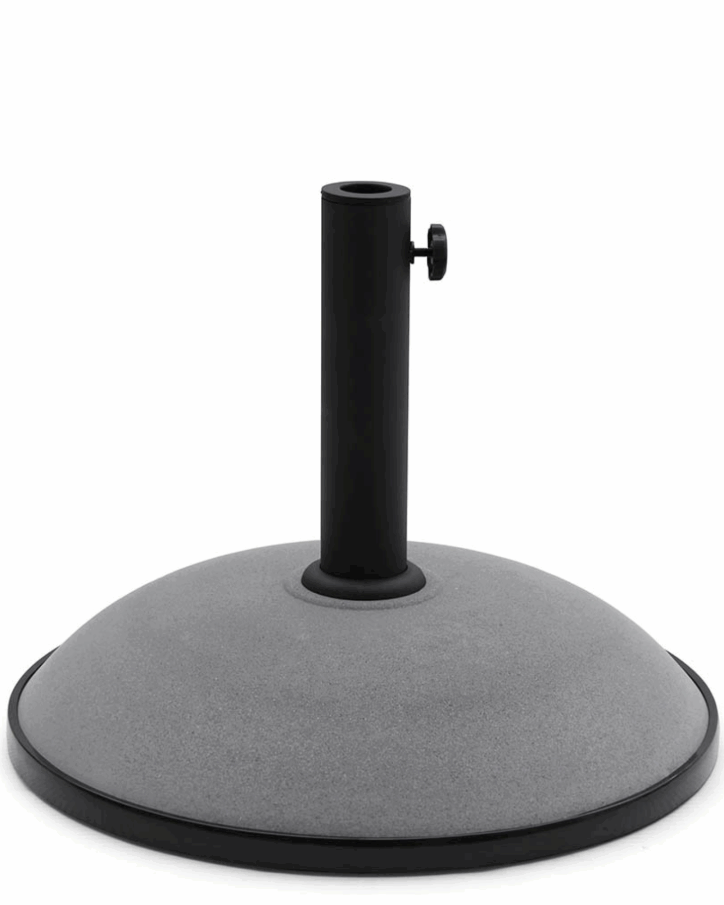Parasollfot i grå betong. Plasthylsor i röret gör att diametern kan justeras mellan 30 och 50 mm. Plastlisten gör att betongfoten kan förflyttas med mindre risk för repor.