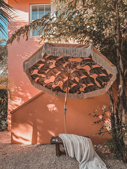 Parasollet Hippo är ett färgstarkt personligt parasoll med lekfulla detaljer som bomullsfransar och svarvad handmålad knopp som finns i färgerna cerise och oljad svensk bok.